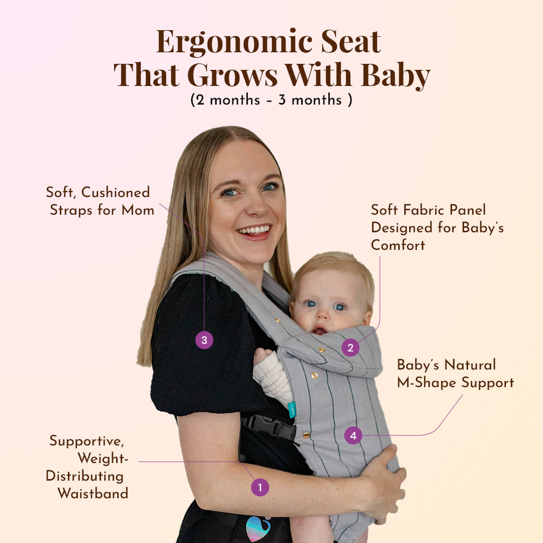 Created with pediatric physical therapists and babywearing experts to ensure superior support for parents and healthy, ergonomic positioning for babies.