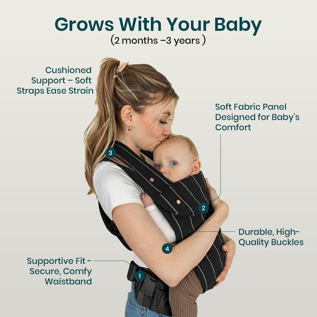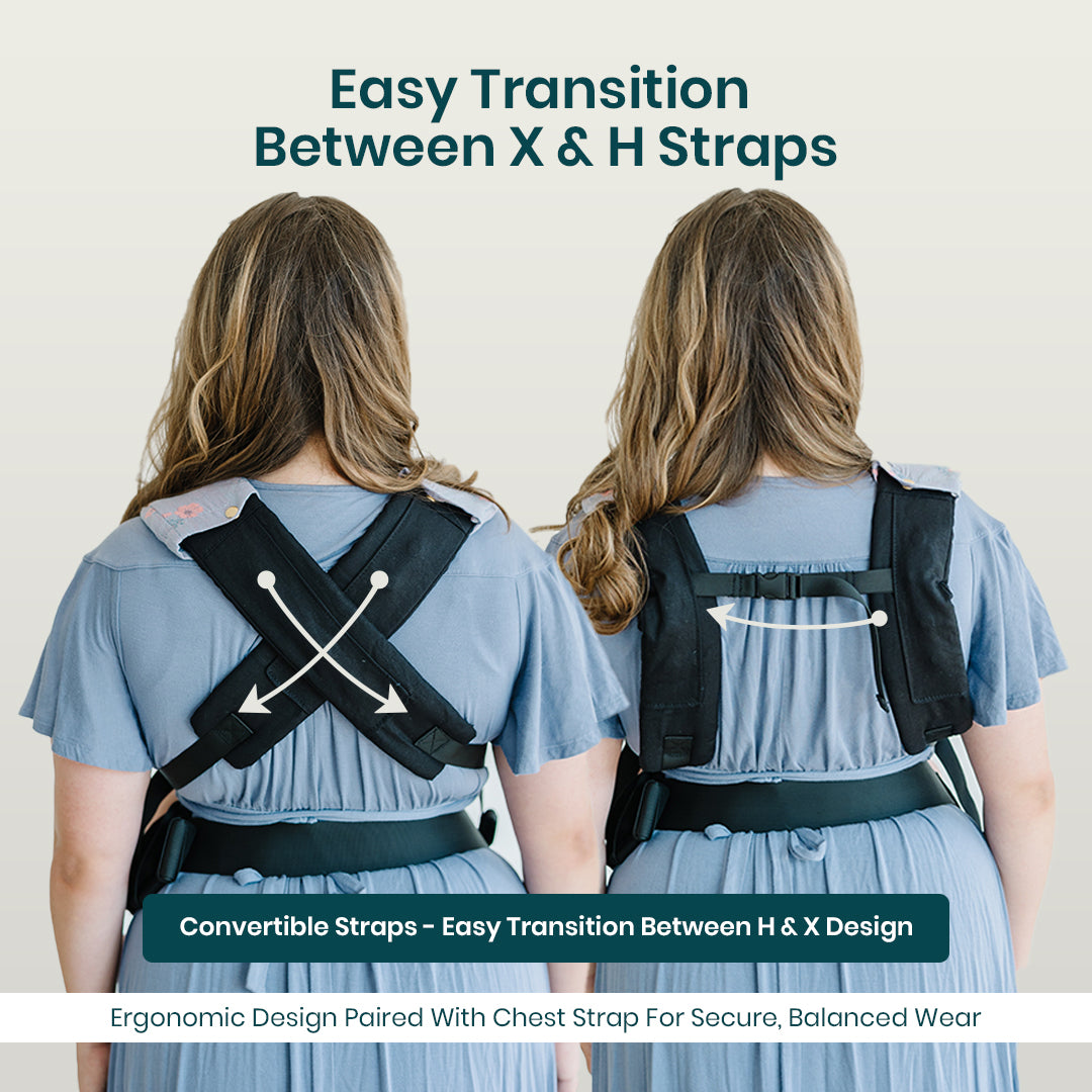 It’s supportive, inclusive (waistband fits 24"–56"), and easy to use shoulder strap with both H and X strap options. It also allows for easy transition between back and front carry positions.