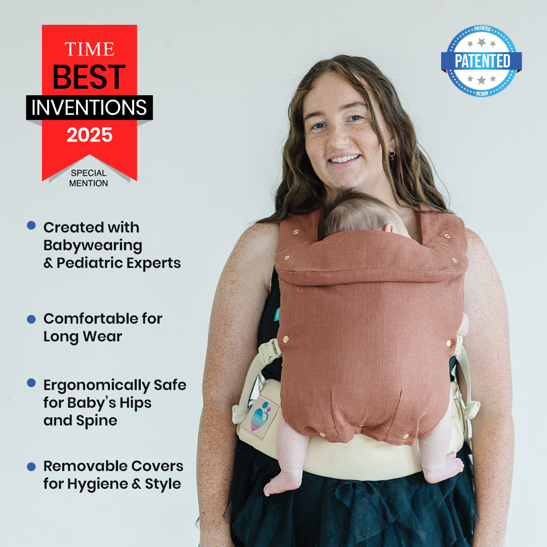 The inner base of our carrier is made with 100% cotton to keep your baby comfortable and cool. The removable outer covers are crafted from breathable, all-natural fabrics like ramie cotton, linen, hemp, and cotton blends, designed for durability, sustainability, and everyday softness.