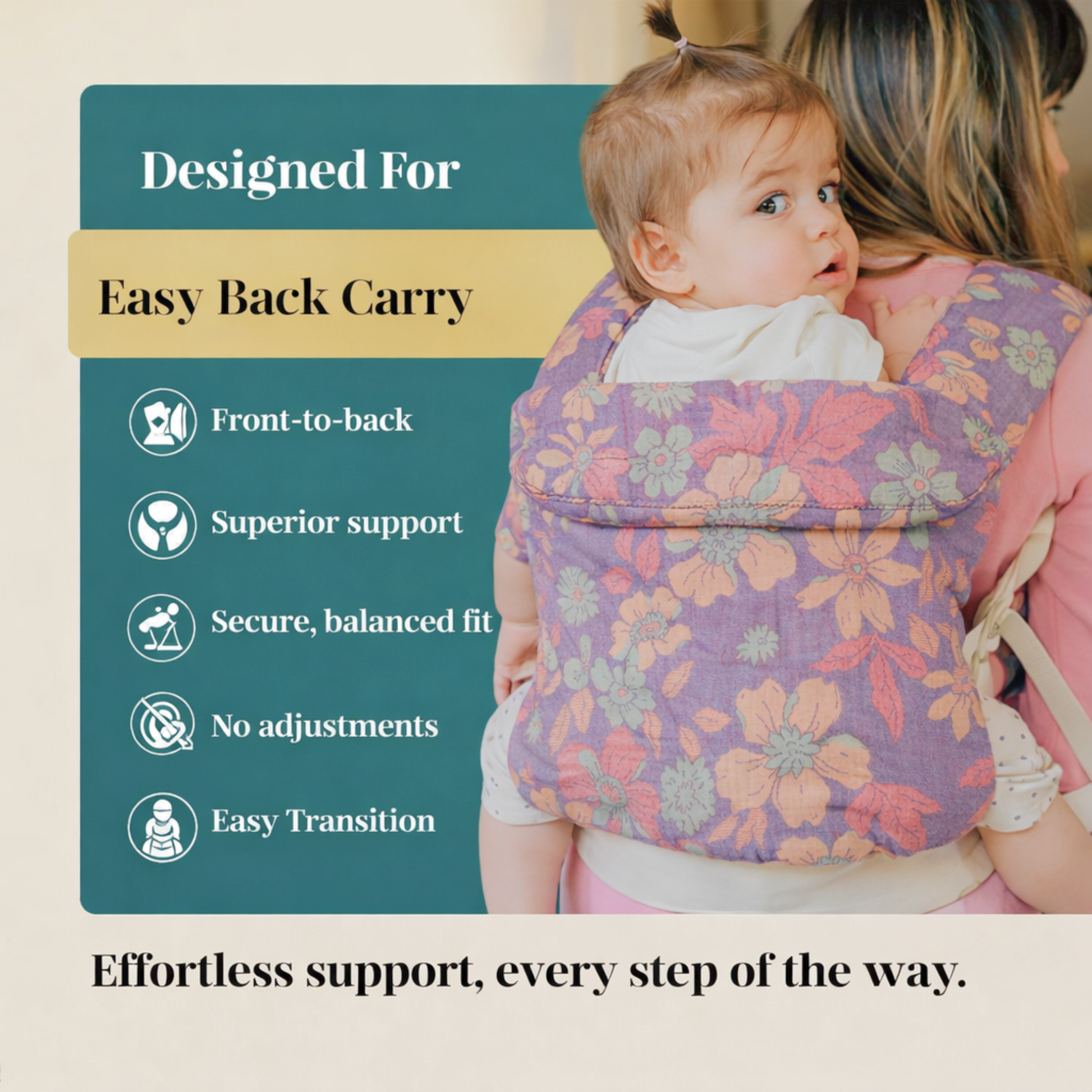 A fabric panel (where baby sits directly) without added fillers allows air to circulate freely between parent and baby. By eliminating bulky padding, heat and moisture can dissipate naturally, helping maintain a balanced, comfortable body temperature across changing conditions.